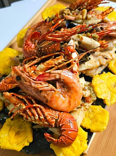 Parillada Marinera para 2 Personas, una exquisita selección de mariscos todo al grill, cuidadosamente preparados y bañados en una armoniosa infusion de salsas que despiertan los sentidos. (Pescado sin espina, Camarón, langostinos, langosta, calamar servido en piedra volcanica